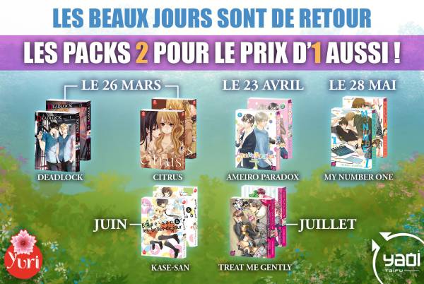 Faites le plein de Romance avec Taifu Comics !Comme annoncé sur leur Twitter, l'éditeur Taifu Comics nous annonce la couleur pour les mois à venir. Un bel arc en ciel composé de vos séries Yaoi et Yuri favorites sera disponible en pack ! Ce qui veut dire que pour l'achat du premier tome, le second est totalement offert ! En tête d'affiche nous retrouvons Deadlock et Citrus qui ouvriront le bal le vendredi 26 mars. Ils seront suivi de Ameiro Paradox le 23 avril et My number one le 28 Mai. Un peu plus tard mais toujours aussi cool, l'expérience se répète avec Kase-san et Treat me gently respectivement en Juin et Juillet.